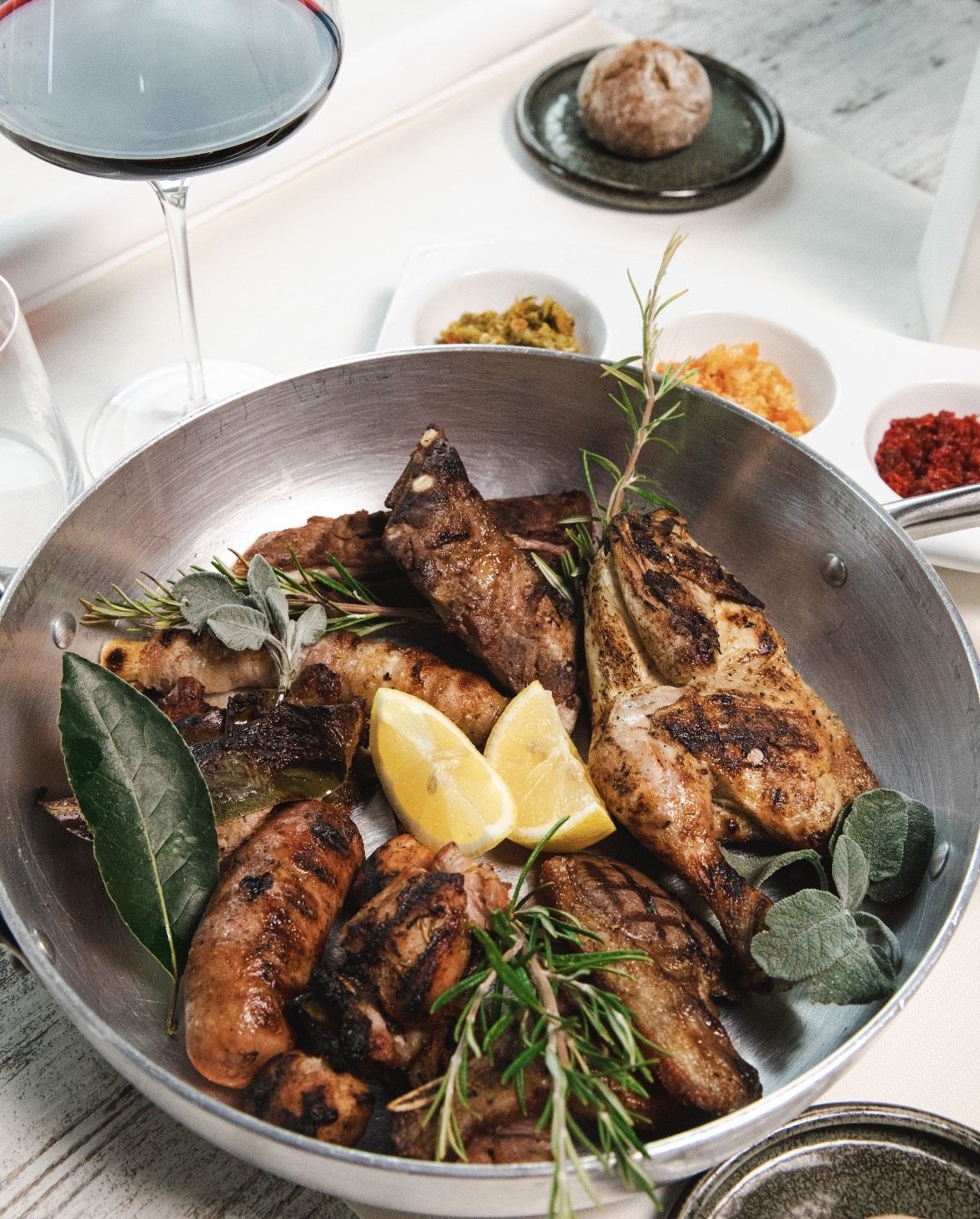 Mixed grilled meat (sausage, meat skewer, glazed pork ribs, lamb steaks, spring onion and bacon rolls, chicken livers, citrus-flavored cockerel) served with giardiniera sauce, ortolano sauce, and beetroot sauce
