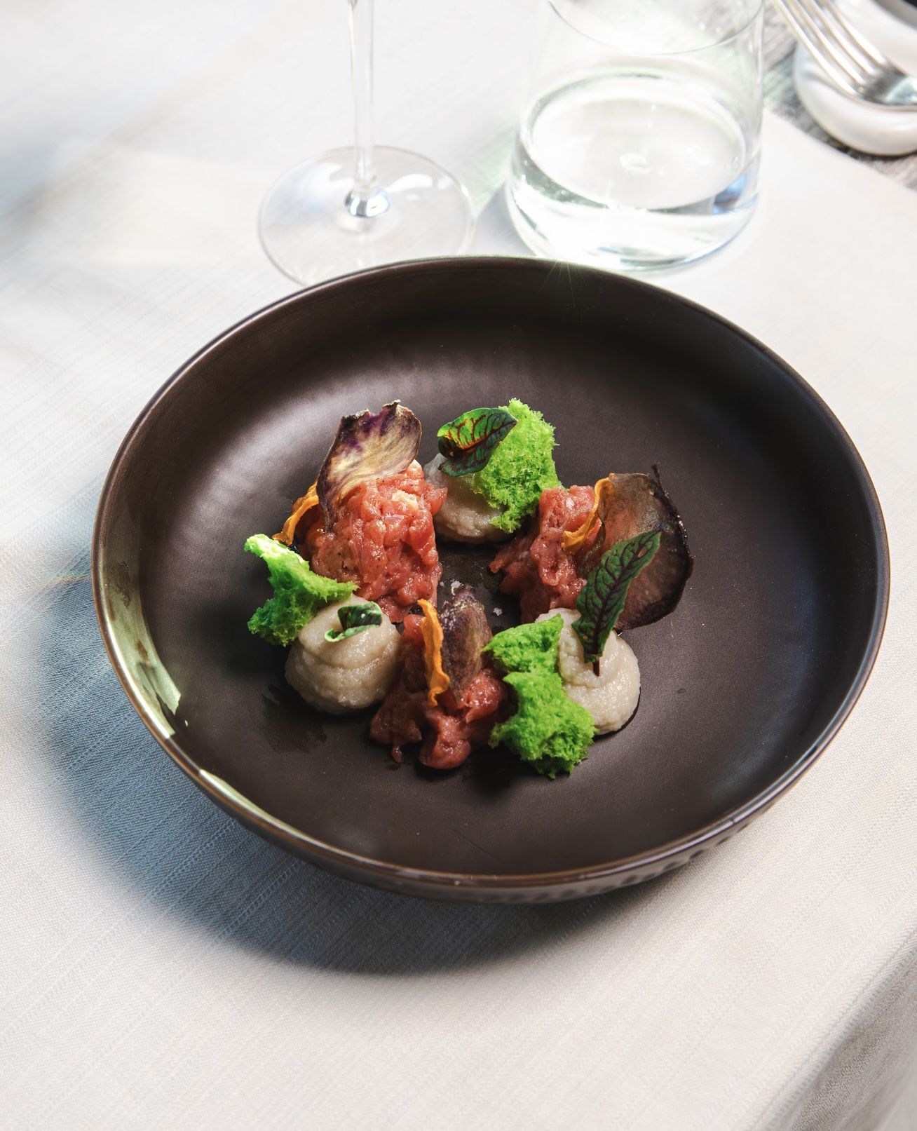 Tartare di Scottona Marchigiana affumicata, con crema di topinambur, chips di patate, spugna al prezzemolo e salsa Worcester