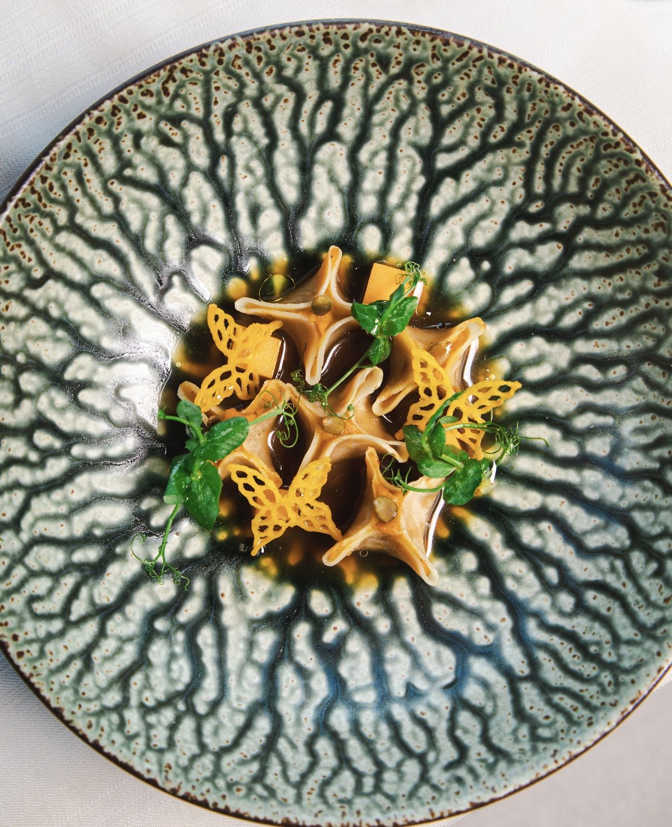 Fagottini di sedano rapa ripieni di zucca arrostita, chips di zucca, zucca in agrodolce e brodo โdashiโ vegetale
